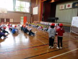 第3保育所の園児が避難経路を確認するために本校を訪れました。年長さんが残って、1年生と交流をしました。玉入れをしたりじゃんけん列車をしたりして遊び、交流をしました。1年生もとても楽しそうでしたが、園児も喜んでくれて、笑顔で帰っていきました。