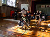 2・3校時に4年生で福祉体験を行いました。本日は車いすの体験で、前回と同様に幸手市の社会福祉協議会の皆様と幸手市のボランティアサークルの方に来ていただき、ご指導を受けました。車いすの補助の仕方と車いすに乗って自走する体験をしました。本日の体験をもとに疑問を持ったことから、調べてわかったことをまとめていく学習に入っていくことになります。