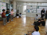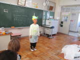 2年1組は5時間目の図工で、自分の作品をお友達に紹介する活動をしていました。お面や帽子と大きなビニル袋を使った衣装を作って、工夫したこと・アピールポイントを発表していました。 |