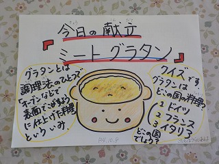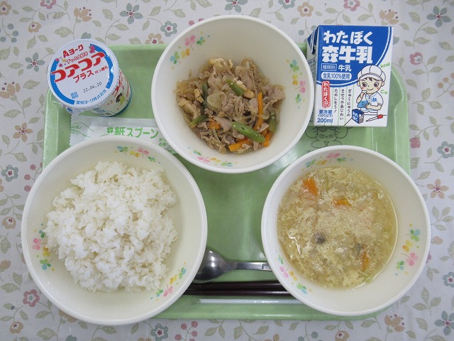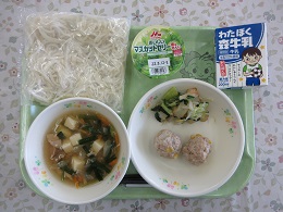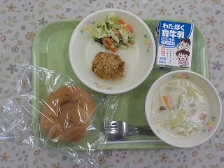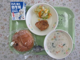 厚い一日、冷たいゼリーが最高です。きれいなスープ。七菜からいろいろな味が染み出て響きあっています。マカロニグラタンは定番のおいしさ。充実の給食です。