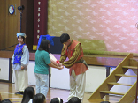 各学年が出し物で歓迎の気持ちを表しました。2年生からは、恒例となった「たね」が贈られて、1年生代表がしっかりと受け取りました。