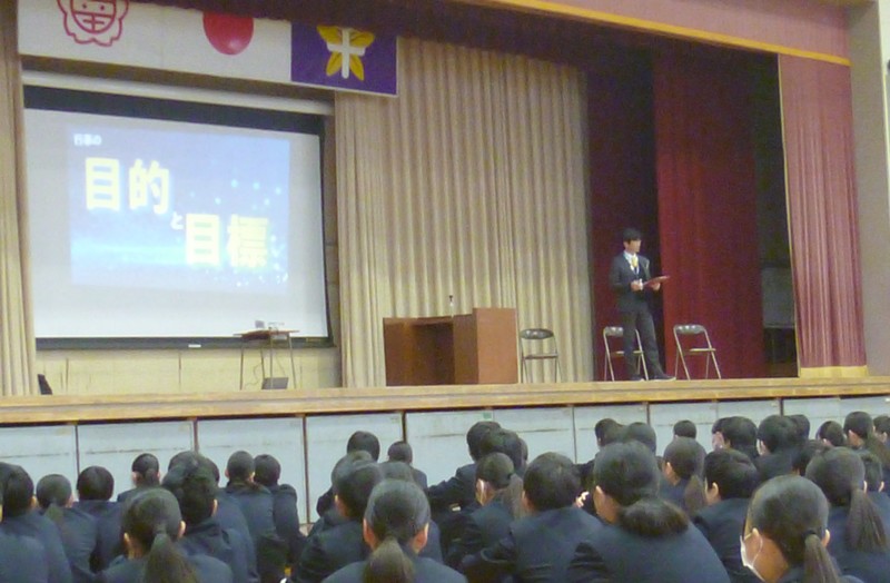 雨模様の朝、体育館では2学期終業式が行われました。