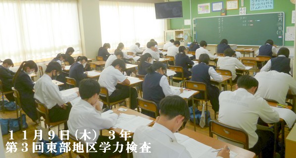 3年生は9日に、第3回の東部地区テストを実施 また、同時期には保護者の方の来校をお願いして三者面 談を実施し、いよいよ進路決定に向けて最終段階を迎えます。