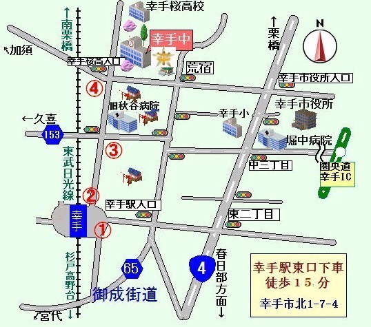 幸手駅東口下車、駅前ロータリーを左方向へに進みます。