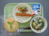 やしろんパン 牛乳 えびフライ サラダ ふわふわたまごスープ |