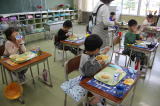 | この日は今年度初めての給食でした。1年生にとっても小学校で初めての給食。用意するのに戸惑っている児童もいて、やはり多少準備に時間がかかりましたが、無事に給食を食べることができました。初めての給食はカレーライスでした。コロナ禍の給食ということで、みんな黙々と食べていました。 |