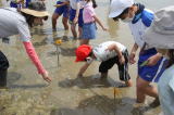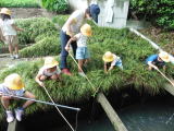 | 2・3校時に田植えを行いました。最初は1年生と6年生がペアになって、6年生が1年生をサポートする形で植えます。1年生にとっては初めての田植えでしたが、上手に植えることができました。次の2・3・4年生では、転びそうになる子はいましたが、スムーズに植えることができました。最後の5年生は、最後ということで少し多めに植えました。たくさん植えることができ、喜んでいました。今日はNHKと毎日新聞、テレ玉から取材があり、カメラを向けられ、インタビューに答える児童がいました。 |