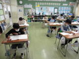 | 今日の2・3校時に4年生以上は埼玉県学力学習状況調査を行いました。普段の単元のまとめテストと違い、問題数が多く四苦八苦している様子でした。課題はやはり、早く・正確に解くことです。授業ではそこを意識して日々実践していくことだと思います。それから業前の時間はハピネスタイムでした。ハピネス体操や吉田っ子体操で汗を流しました。 |